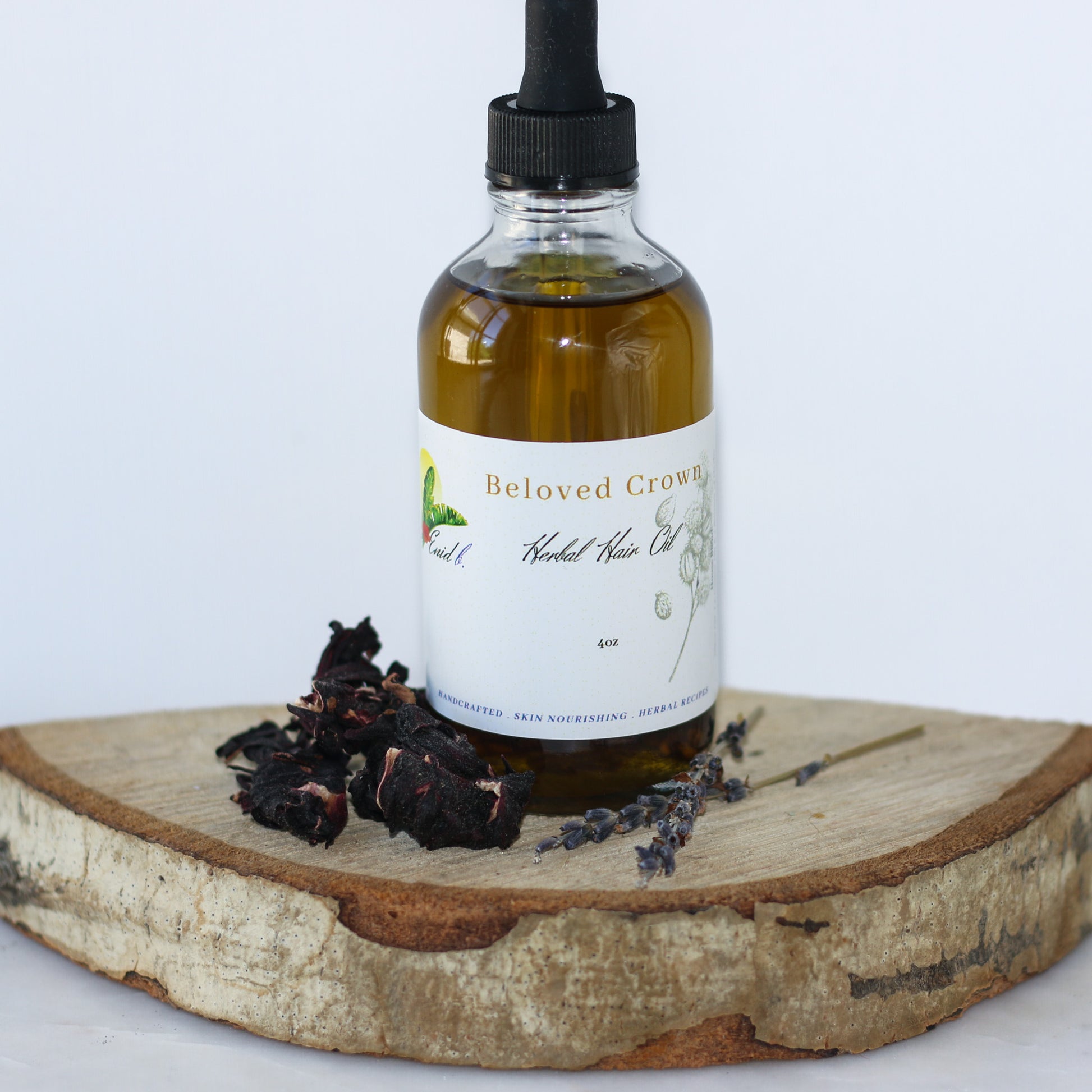 Our hair is often put under much stress with all the pulling, twisting, dyeing and heat we apply to it. With this in mind I created my Beloved Crown Hair Oil. Crafted with a blend of extraordinary herbs and oils like amla (Indian gooseberry), horsetail, organic jojoba oil, black Jamaican castor oil and many more. These herbs and oils have been used amongst different cultures in folk medicine for centuries to promote hair growth and healthy, nourished strands.